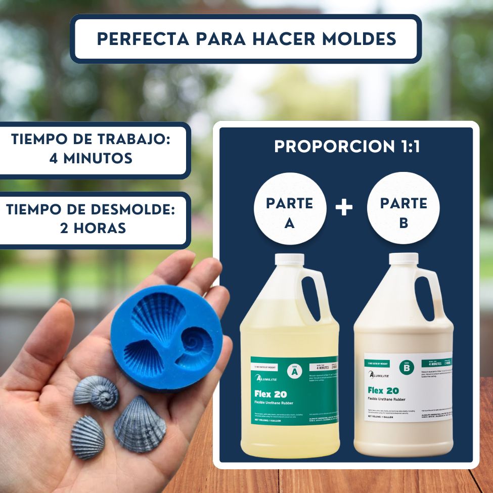 • Alumilite Flex 20 es una goma de uretano suave, flexible pero duradera y fácil de usar, acepta colores y permite una excelente reproducción de detalles y partes.