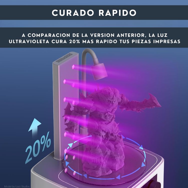 - Al utilizar una nueva disposición de cuentas y una fuente de luz de lente, Wash & Cure 3.0 ofrece una mejora del 20 %* en la uniformidad del curado con respecto a la generación anterior 2.0. Esto da como resultado un curado más completo y completo de todo el modelo.